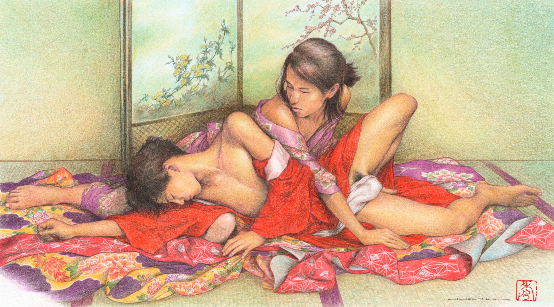 ① Bugatti Type 51 GT around 1973~1974 / ② Dictionary 1998 / ③ Sea Slug around 2000 / ④ Early Spring, the cover picture of Barazoku magazine No.338 2000 / ⑤ Unknown, the illustration picture of Barazoku magazine No.337 2000 / ⑥ Soccer Boy, the cover picture of Barazoku magazine No.350 2001 / ⑦ Young Bacchus’s Temptation 2005 / ⑧ Blue Phoenix 2010 / ⑨ Incarnation : Khan 2011 / ⑩ Young Lion 2013 / ⑪ Puppy Boy 2013 / ⑫ Dozing Off 2016 / ⑬ Banquet at Male Love Teahouse 2020 / ⑭ Time of the fragrant breeze blows 2025